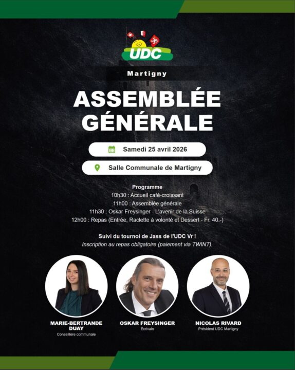 Nous avons le plaisir de vous convier à l’Assemblée générale de l’UDC Martigny, qui se tiendra le samedi 25 avril 2026 à la Salle communale de Martigny (Rue des Petits- Epineys 7, 1920 Martigny)