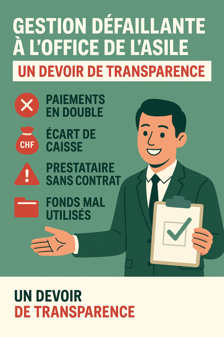Le rapport annuel 2024 de l’Inspection cantonale des finances révèle une faillite alarmante de la gestion de l’Office de l’asile (OASI), placé sous la responsabilité directe du conseiller d’État socialiste Mathias Reynard. Les constats sont sans appel : dysfonctionnements systémiques, opacité financière, conflits d’intérêts et violations du cadre légal. L’UDC du Valais romand tire la sonnette d’alarme et demande des mesures immédiates.